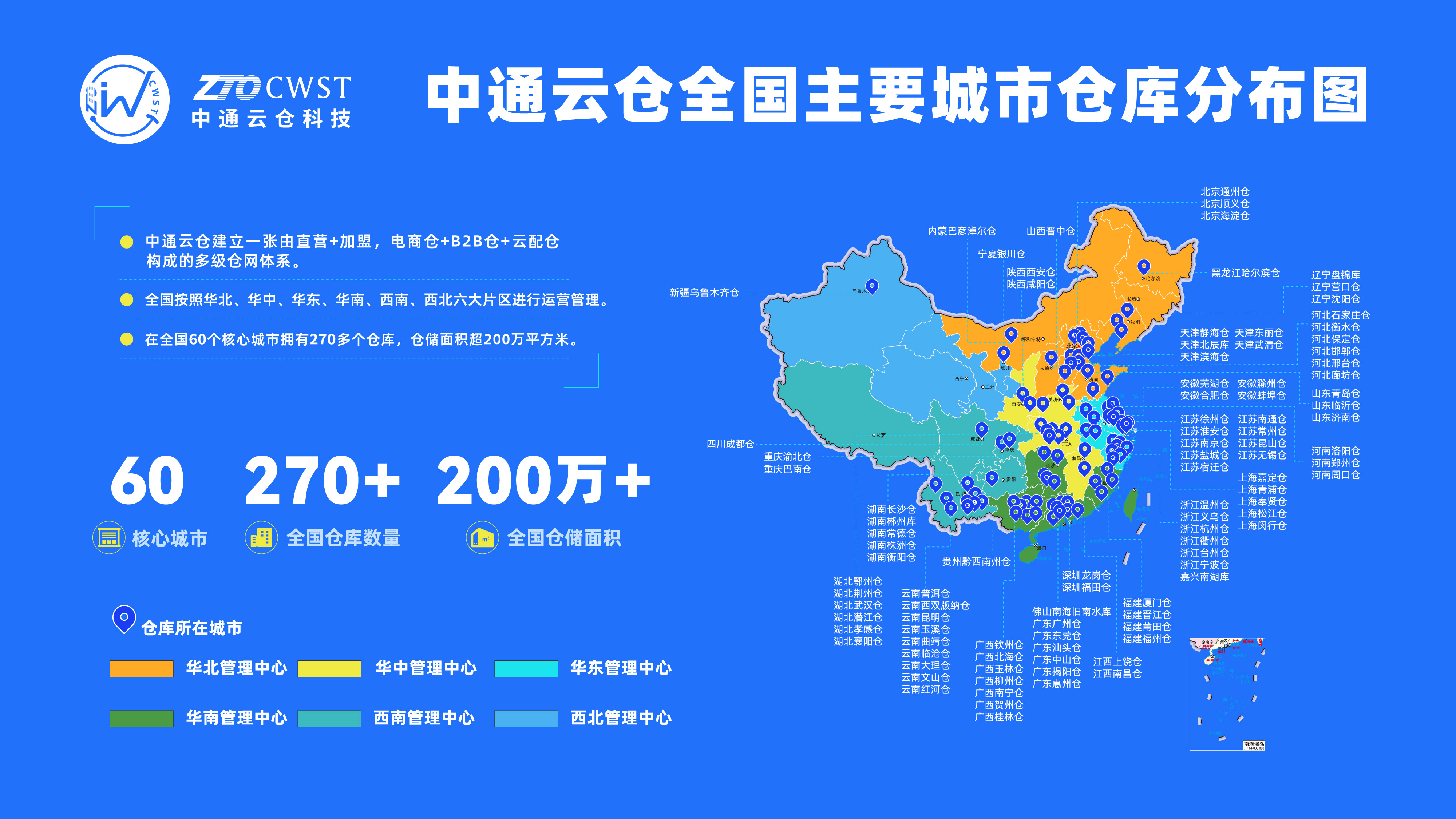 中通云倉科技建立了一張由直營+加盟,電商倉+B2B倉+云配倉構(gòu)成的多級倉網(wǎng)體系。全國按照華北、華東、華南、華中、西南、西北六大管理中心進(jìn)行運(yùn)營管理。在全國60個核心城市擁有270多個倉庫,倉儲面積超200萬平方米。了解更多